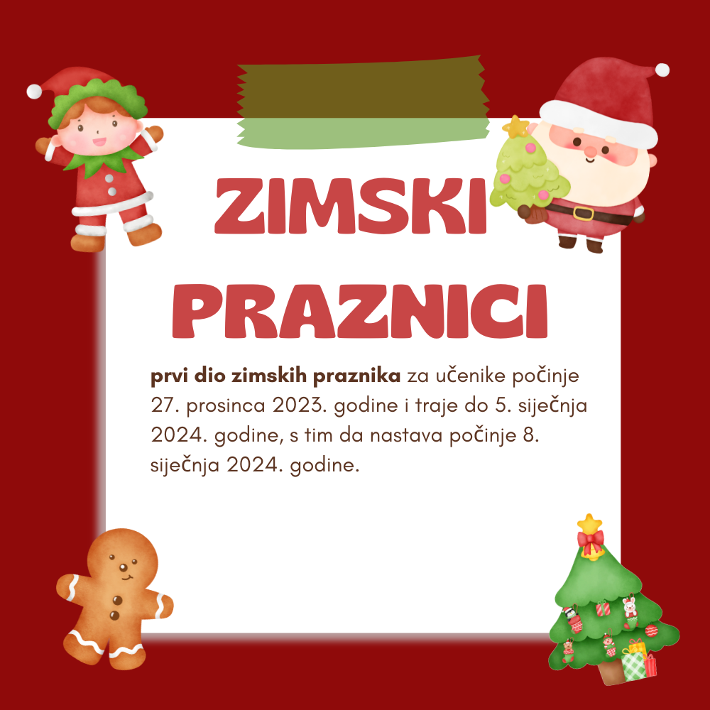 Prvi dio zimskih praznika za učenike počinje 27. prosinca 2023. godine i traje do 5. siječnja 2024. godine, s tim da nastava počinje 8. siječnja 2024. godine.